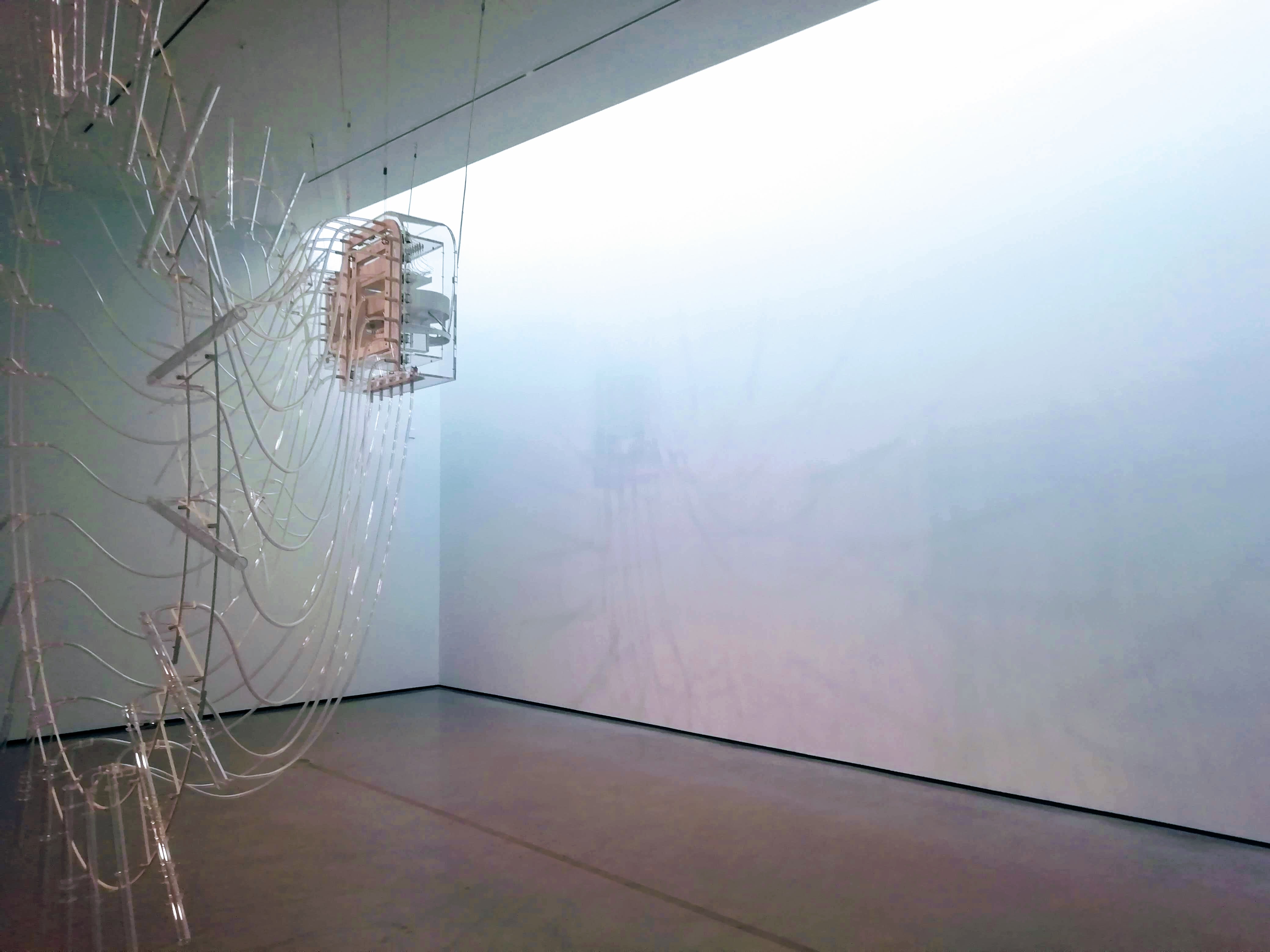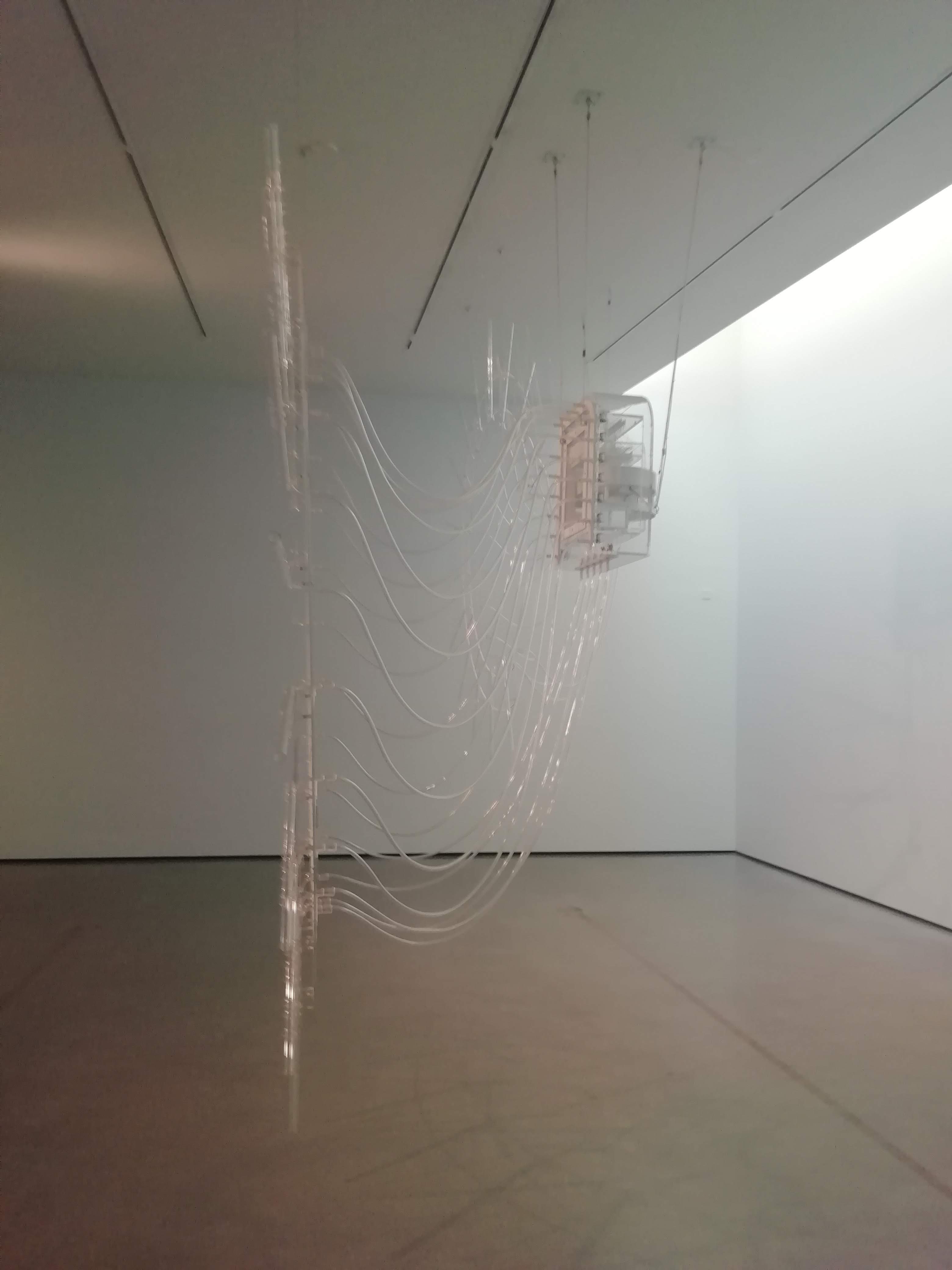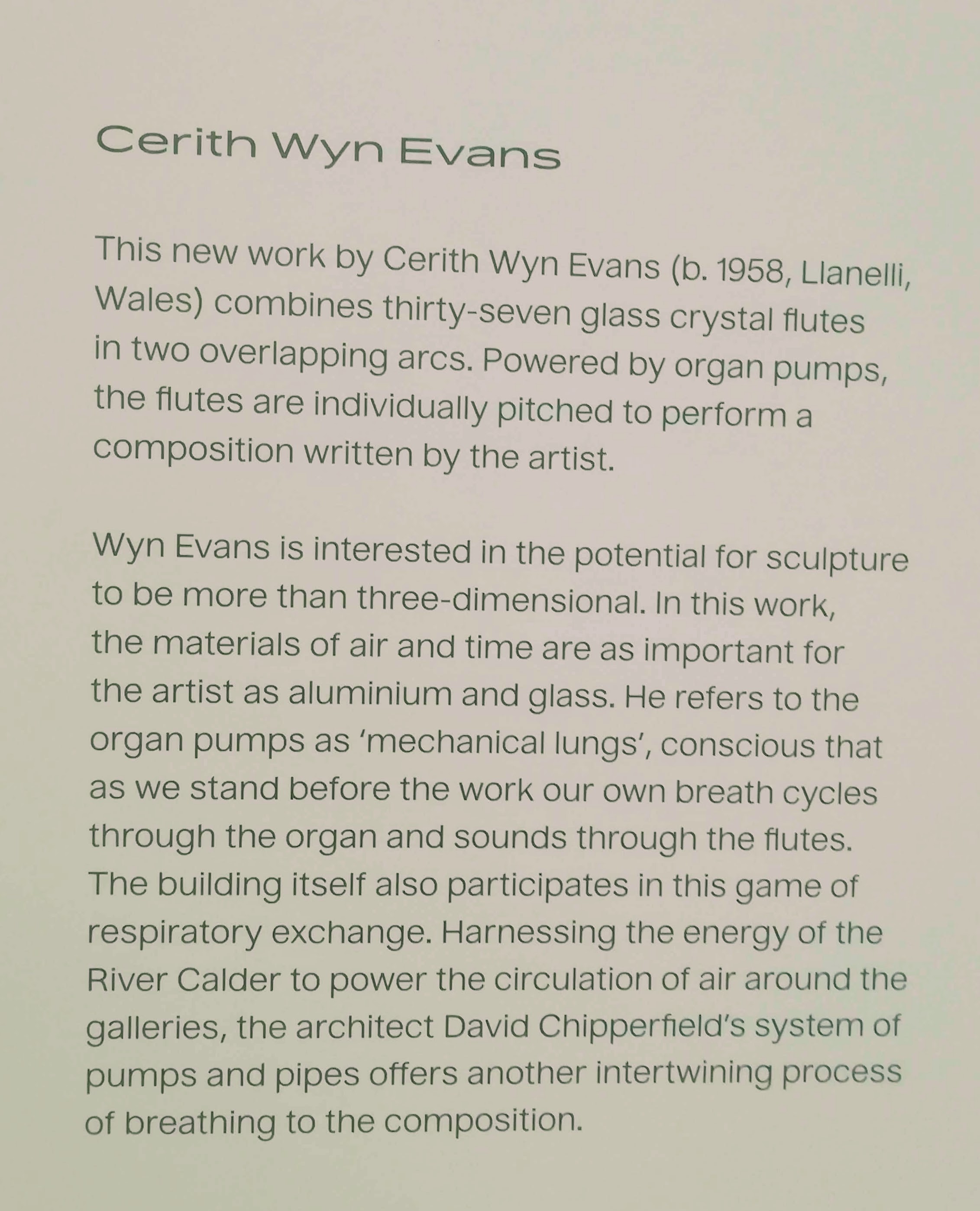 The main reason for my visit was a work by fellow Welshman, Cerith Wyn Evans. I’d been trying to find time to see and hear it since November. It was a collection of crystal flutes transfused to 2 air conditioning units, pumping noiselessly with barely detectable motion. It was silent until, from nowhere, a wave of sound surged up, crescendoing to a quietly jarring and slightly disturbing mismatched fusion of eerily clashing notes.