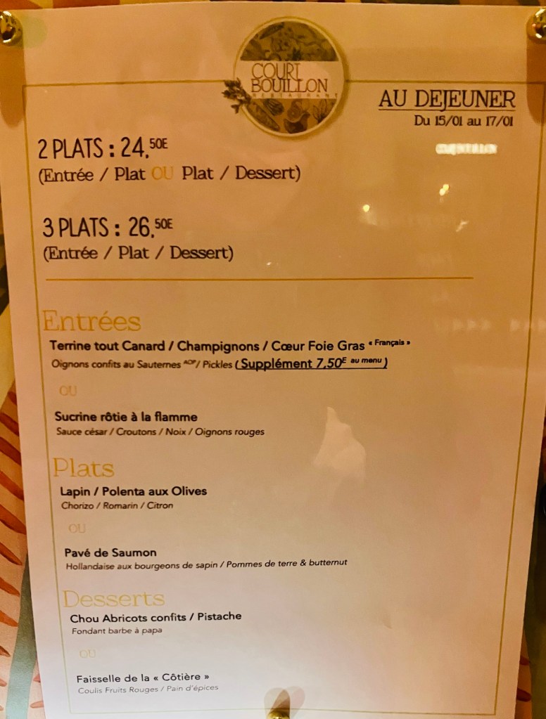 On Wednesday I had a lunch date – with myself! I couldn’t possibly go to Lyon and just have soup so I treated myself to a nice meal at a restaurant I’d spotted near the flat called Court Bouillon (Stock). It appealed to me as it wasn’t very tourist oriented and the owners seemed passionate about produce and their style of cooking. There was a choice of 2 starters, 2 mains and either cheese or dessert on the lunch menu.