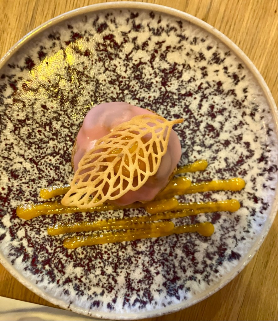 Dessert was a playful candy floss glazed Chou bun filled with a decadent pistachio cream dressed with apricot coulis and an intricate biscuity tuile. The cream tasted more of pistachio than actual pistachios, it was a delight.