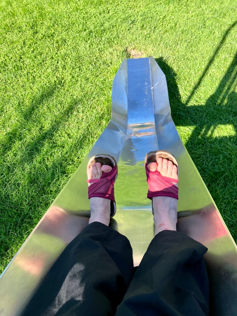 We got out 3 times! The wheelchair was christened on a short ride to the park. I needed to practice using it. Where’s the brake?!! Even though I wheeled it super slowly, she still grumbled at any bumps. I know she’s in pain. I felt a bizarre sense of deja-vu as she observed me messing about on the playground equipment.